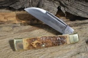 The Trestle Pine "Gunflint" is a single blade version of the Topper. A Wharncliffe CPM154 Blade with a long pull means easy opening for even gloved hands. Handle materials included Mammoth Ivory.